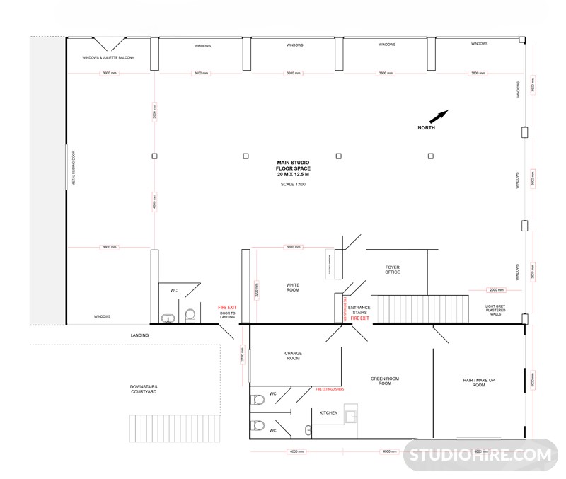Separate from the main studio; kitchen area, green room, makeup station, changing space 3 loos.