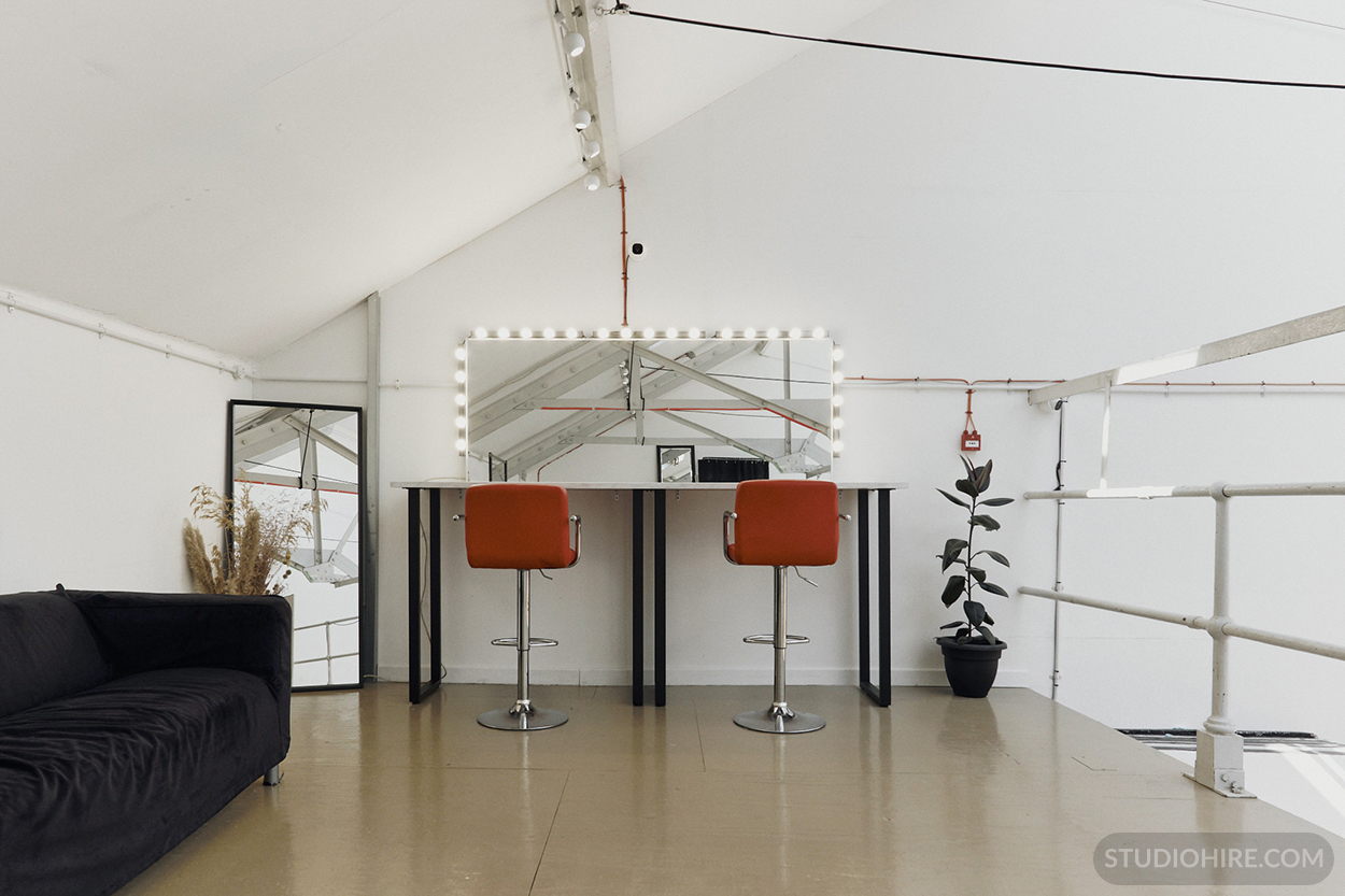 The mezzanine now features a new professional makeup and styling area designed for larger teams and productions requiring dedicated preparation space and natural light.