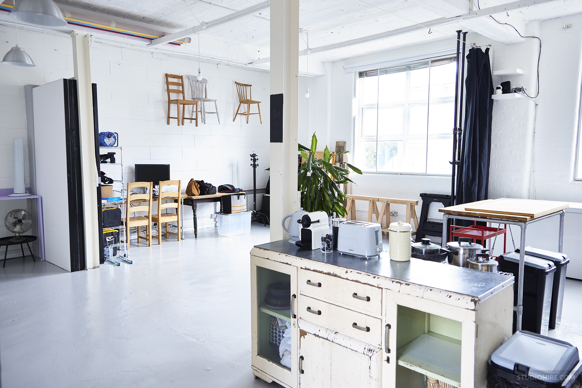 Daylight or blackout studio with fully equipped kitchen ideal for food – drink – still life shoots.