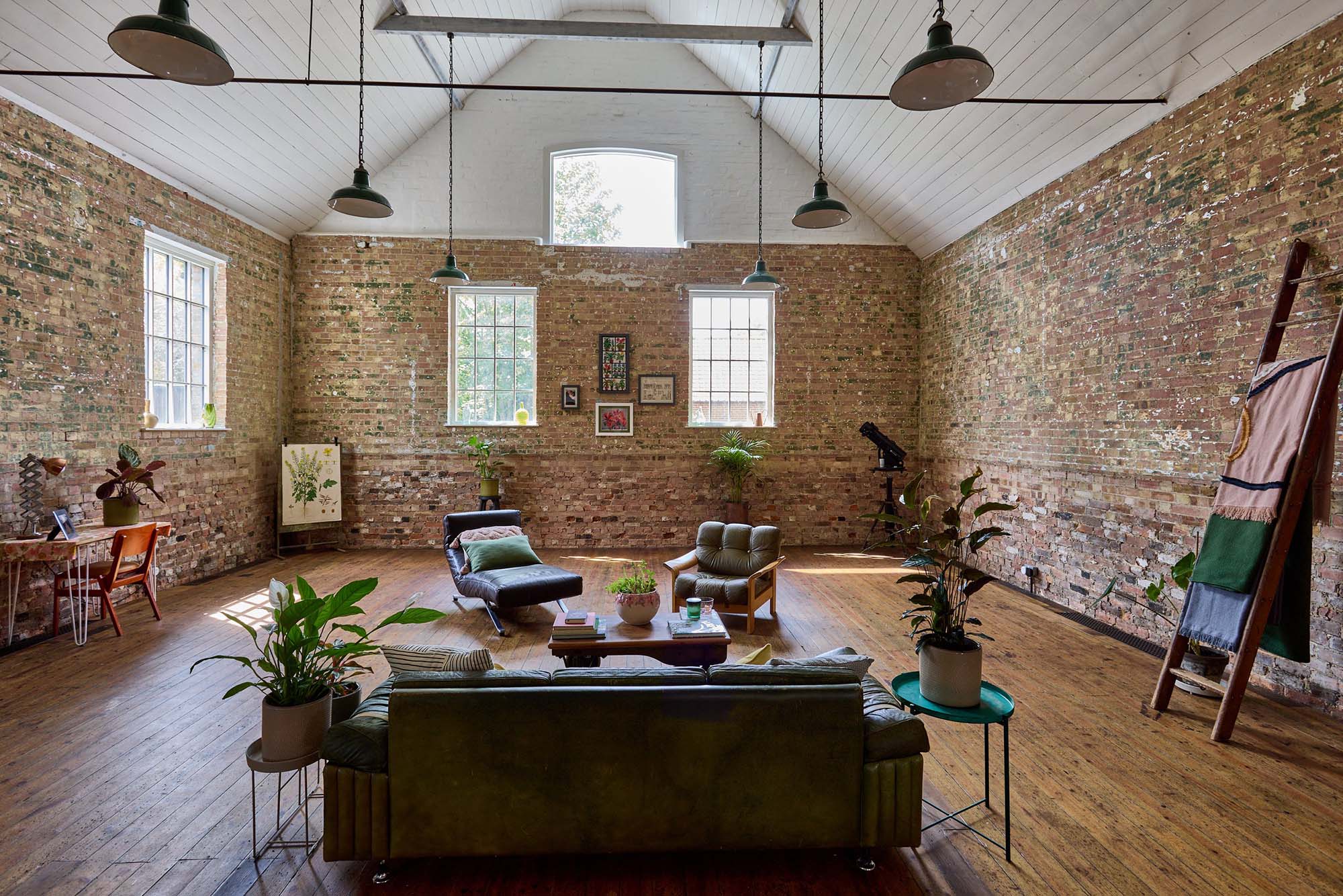 This location house in West Norfolk is housed in a former Victorian village hall, the space benefits from natural light, double height ceilings, original features, exposed brickwork, industrial metalwork, and eclectic styling.