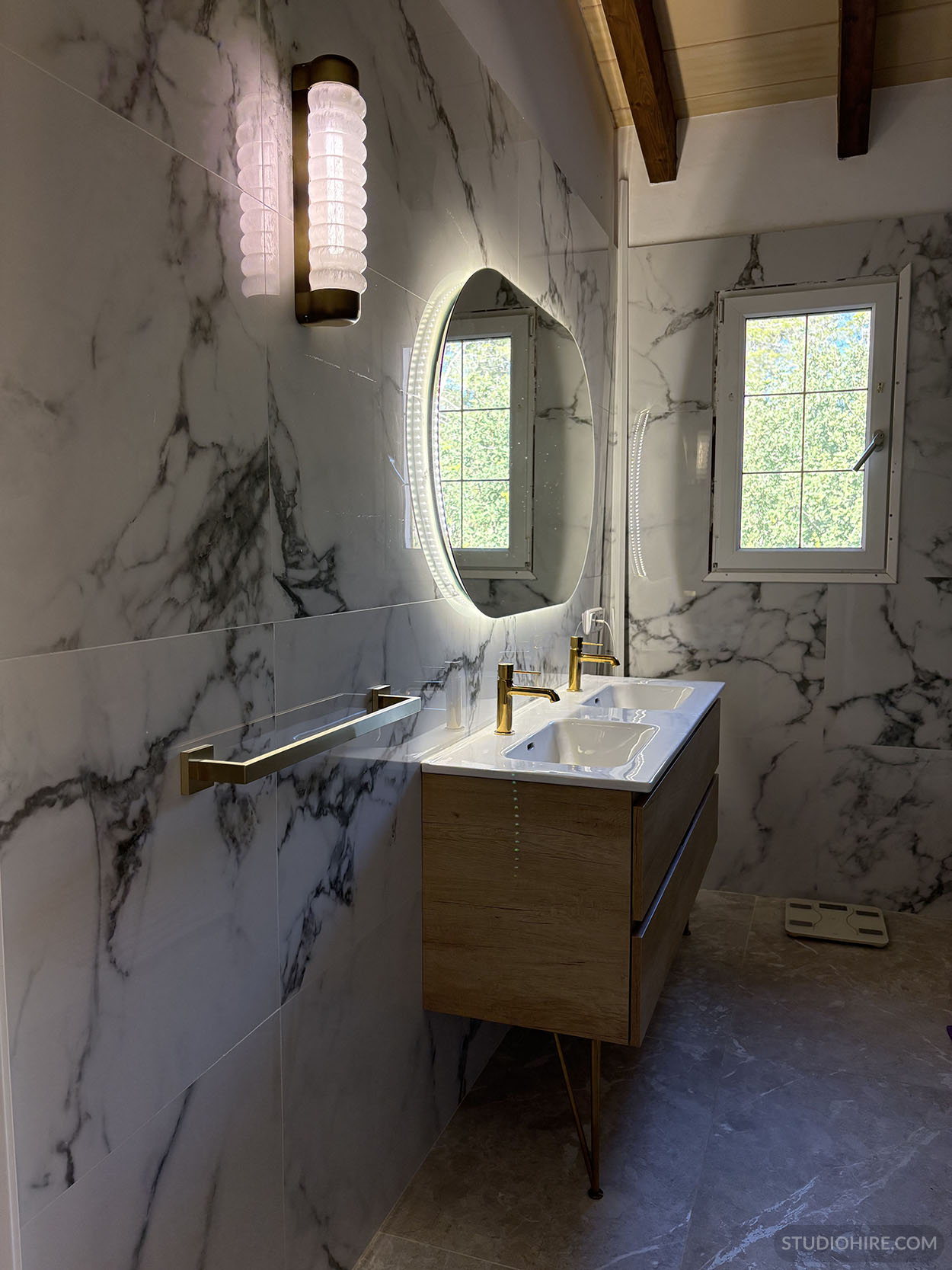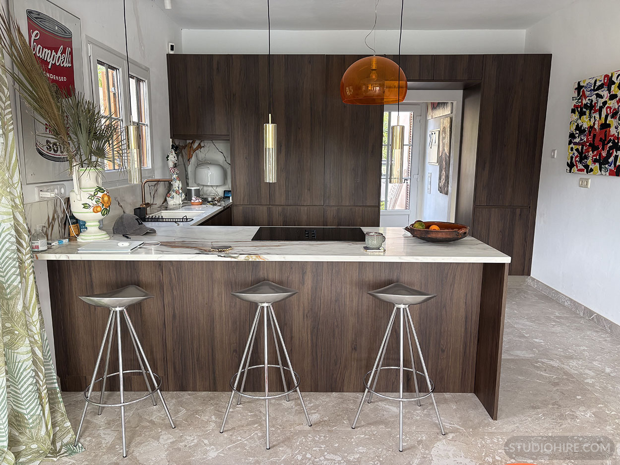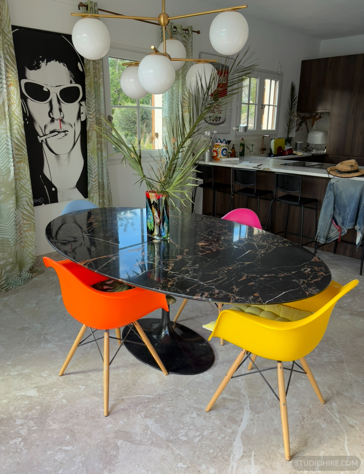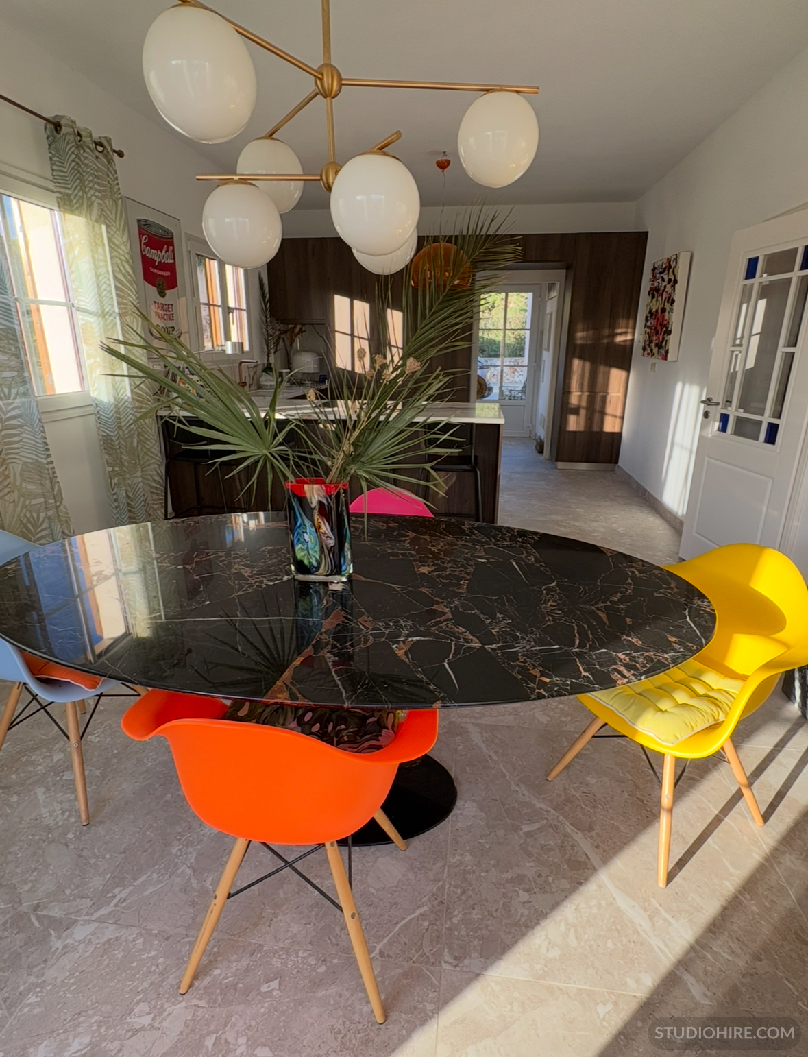 The large sun filled kitchen, designed in a chic 70s narrative, is ideal for food shoots.