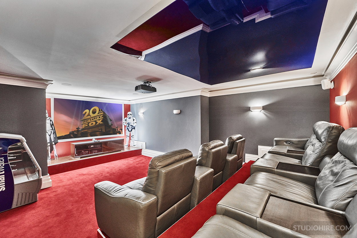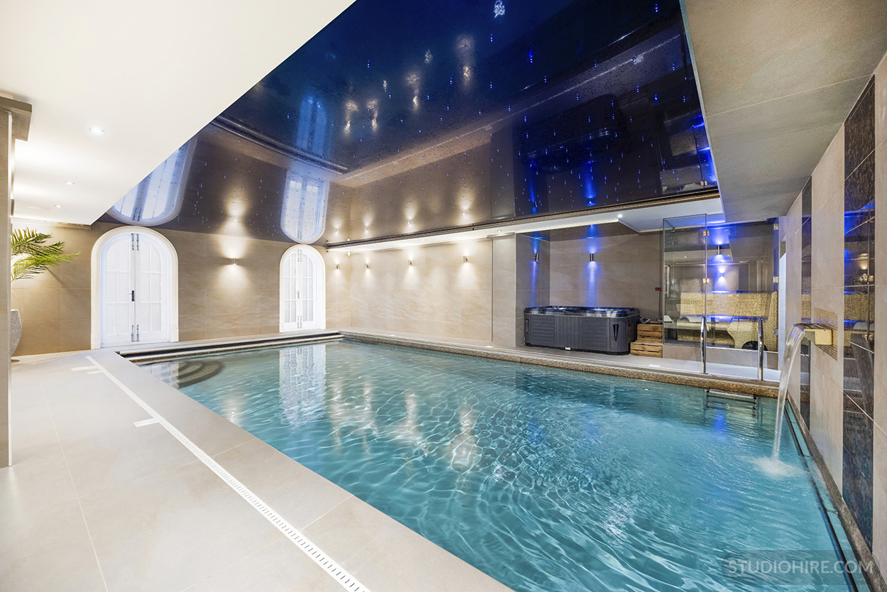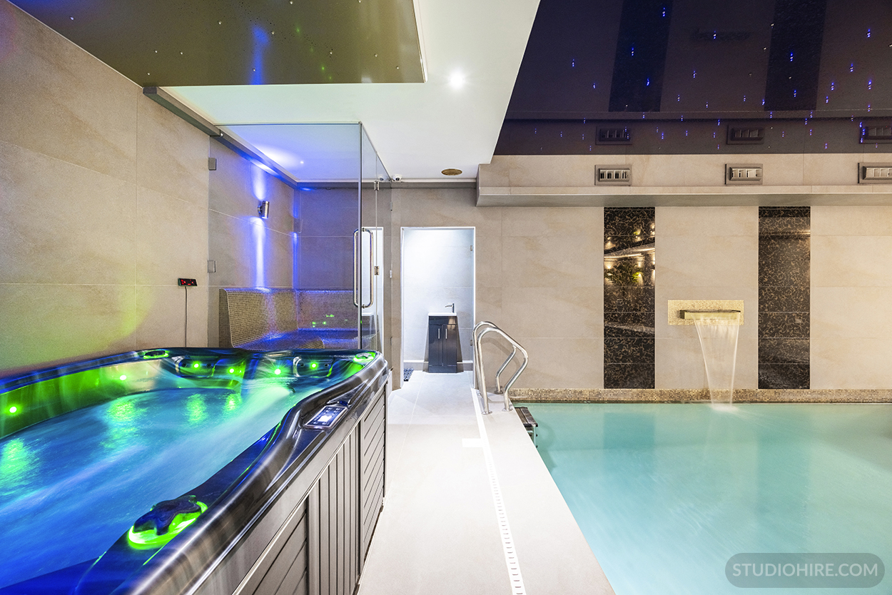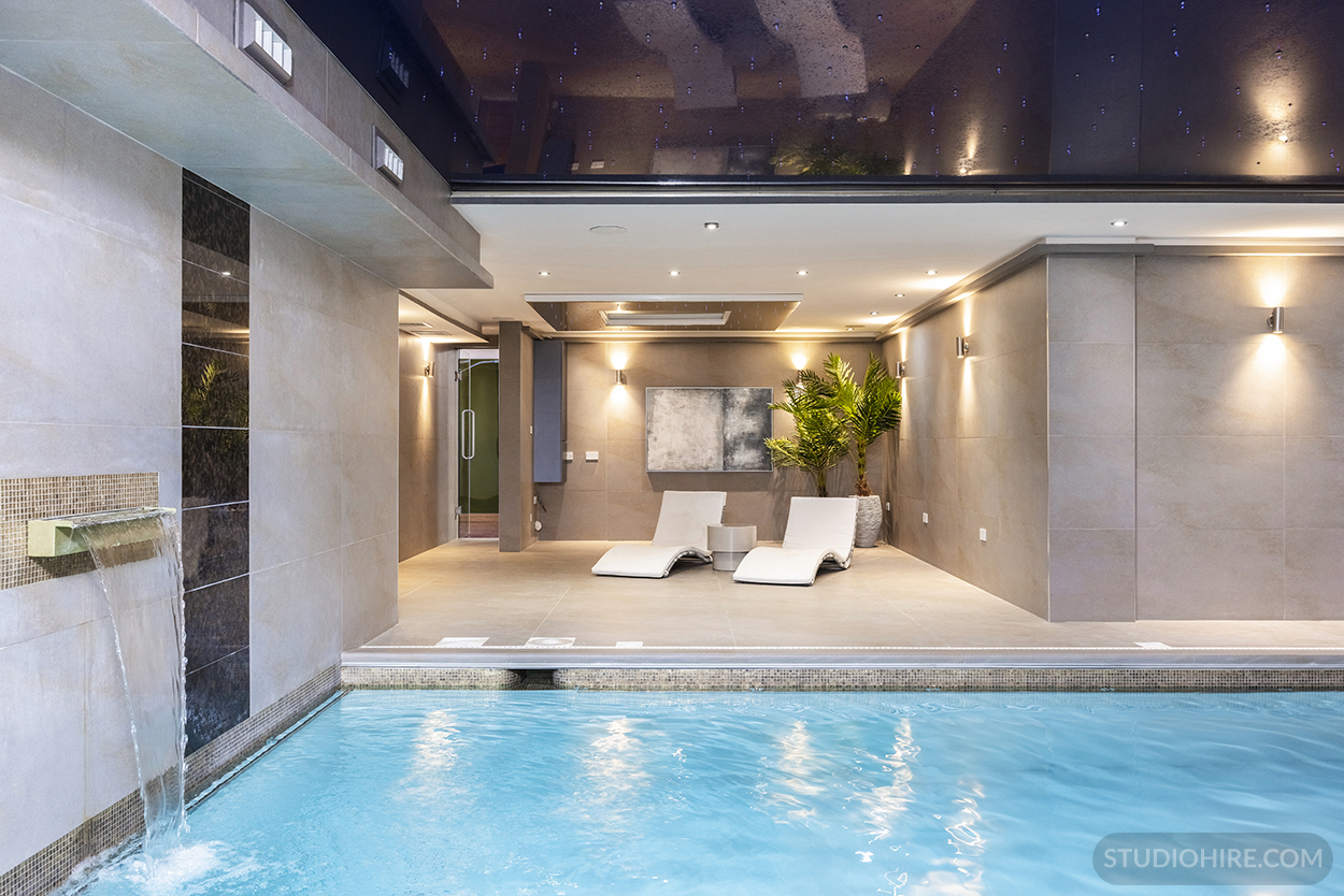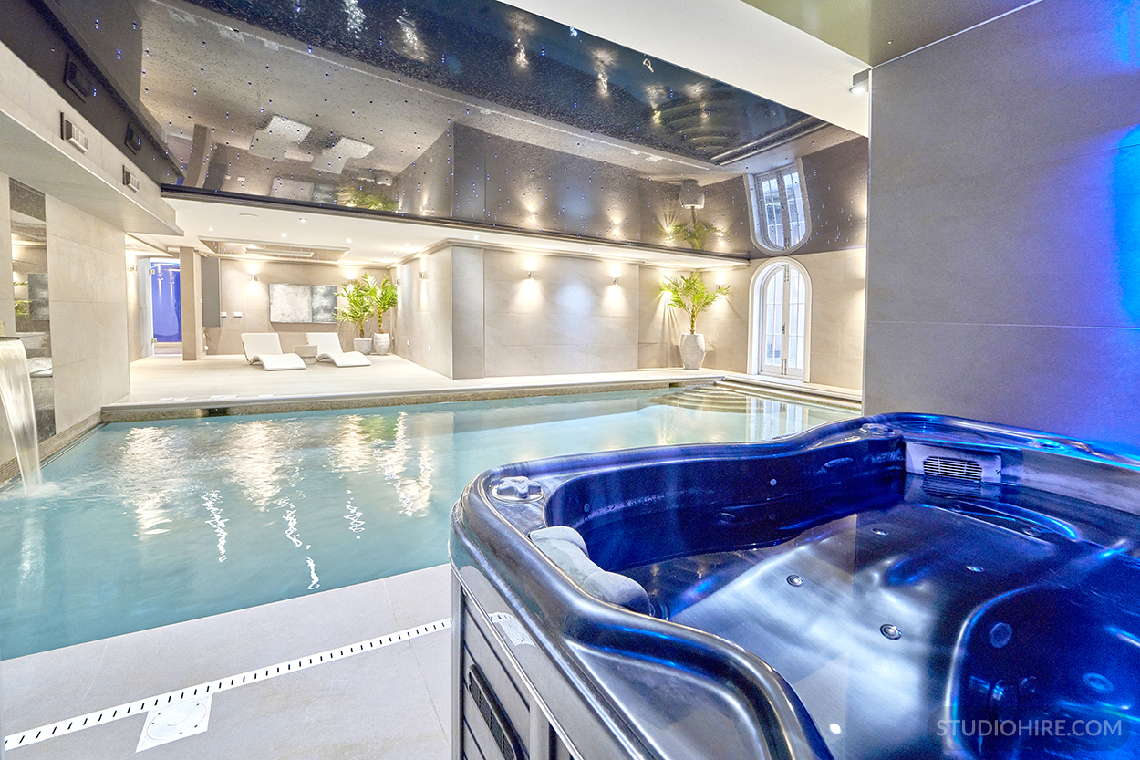 Inside, the mansion features elegant living spaces, a private cinema room, a heated indoor swimming pool and both indoor and outdoor jacuzzis — perfect for lifestyle, fashion, wellness and luxury–themed productions.