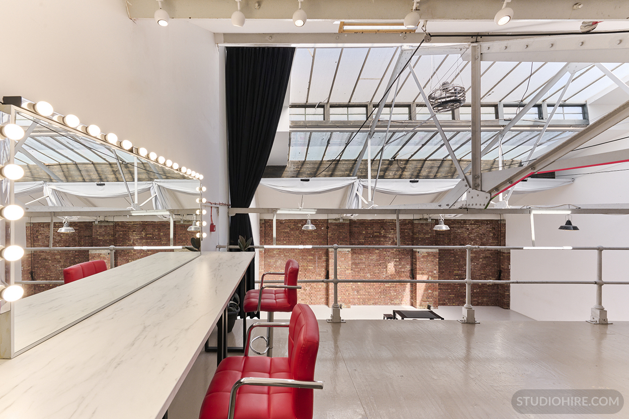 The mezzanine now features a new professional makeup and styling area designed for larger teams and productions requiring dedicated preparation space and natural light.